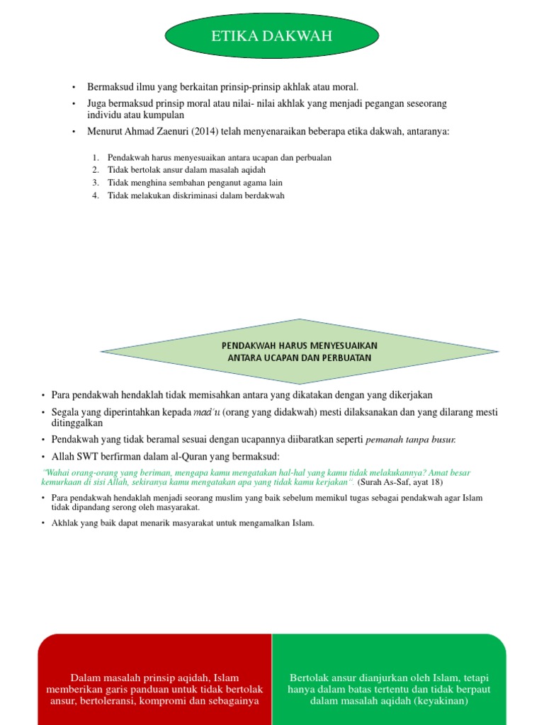 Tidak Memisahkan Antara Ucapan dan Perbuatan. Hal itu disebabkan terdapat sedemikian banyak perintah dalam Al-Quran dan Sunah rasululah untuk berdakwah dan amar maruf nahi mungkar. Berdakwah dengan Cara yang Mudah.